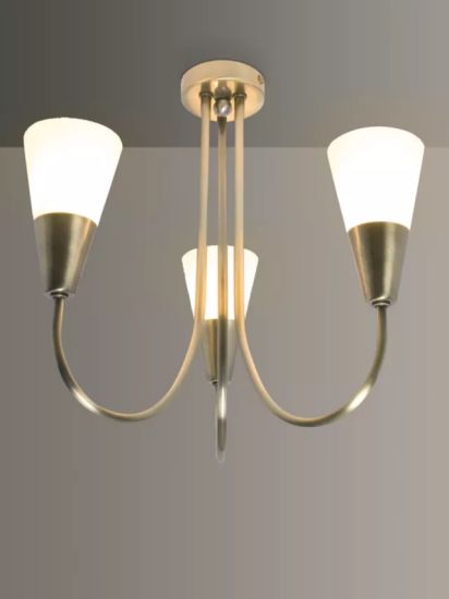 With a design that's traditional but easily adaptable, this excellent value ceiling light features three sweeping arms teamed with frosted glass, cone-shaped shades. It offers a warm wash of light and it's available in a choice of finishes.