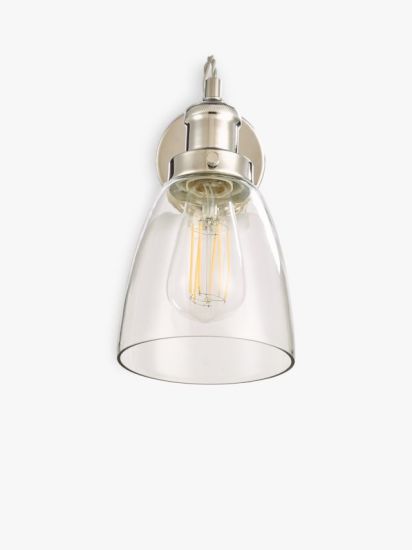 • This timeless wall light fits a modern country aesthetic, thanks to its clear glass lampshade and polished nickel metal fittings. Simple, yet sophisticated, it offers a warm glow of light and we recommend choosing a vintage LED bulb with a decorative filament for a more atmospheric lighting effect. Easy to style around your home but especially useful next to your bedside.